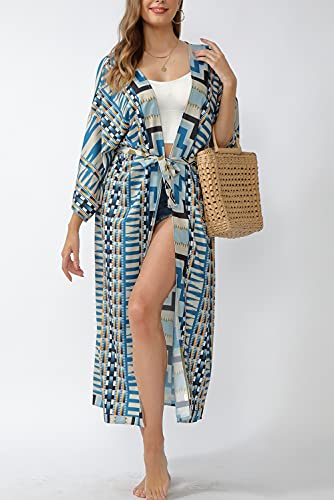 Iris Sprite Women Swimsuit Cover Up Embroidery Print Cardigan Kimono Long Beach Dress Floral Bikini Swim Coverup for Summer(Beige-02)