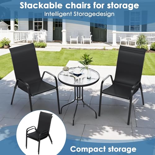 This is a 3 piece patio bistro set designed for outdoor dining, drinks and relaxed conversation in compact spaces such as balconies, terraces, gardens and poolside areas. Compared with larger lounge furniture, this type of set is better suited to neat upright seating that is easier to place and move around. The round tempered glass table and two ergonomic high back chairs create a more practical setup for everyday outdoor use, while the stackable design makes it especially useful in areas where space matters. Buyers usually choose this style over bulkier furniture when they want a simple, reliable and more space efficient way to sit outdoors.