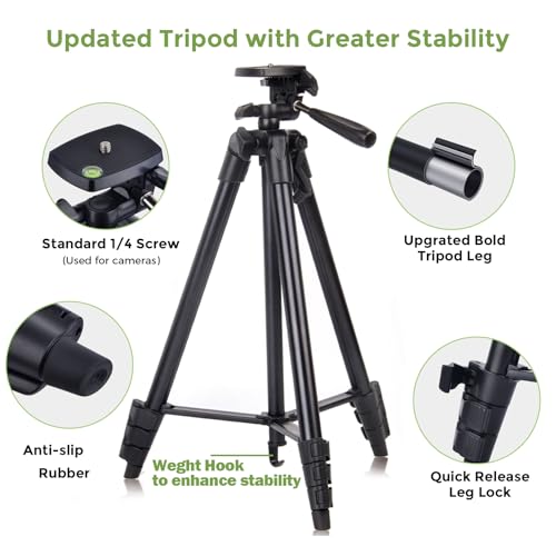 - 【Widely Compatible】 This phone tripod features a universal 1/4" screw mount, allowing you to effortlessly connect it to digital cameras, action cameras, webcams, camcorders, ring lights, and small projectors. Please note that it is not recommended for use with heavy DSLR cameras and projectors.