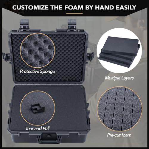 Lay your equipment on the foam before removing any sections to plan the layout. Remove only the foam you need so each item fits snugly. Leave foam between items to improve shock absorption. Always check the seal is clean before closing the lid, and ensure all latches are fully secured before transport.