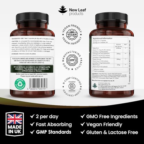 Maca Root Capsules with KSM Ashwagandha and Ginseng – 180 High Strength 6000mg Maca Root + Ashwagandha KSM-66, Panax Ginseng & Black Pepper – Vegan Capsules Made in The UK