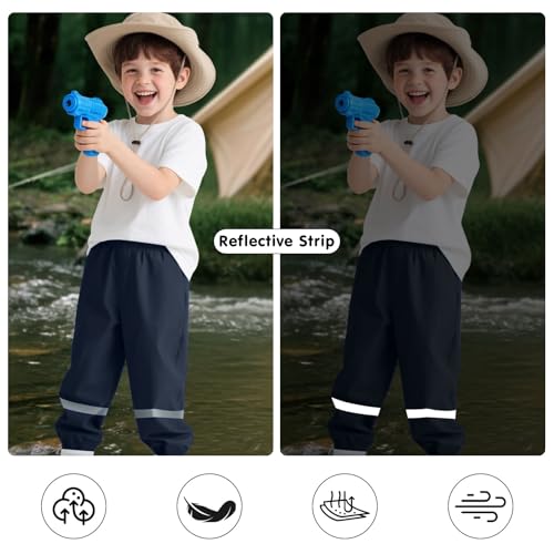 - 【Reflective Safety Design】Featuring reflective strips on the legs, these girls waterproof trousers and boys pants provide extra visibility on rainy, foggy, or dark days, making outdoor play safer and giving parents peace of mind.