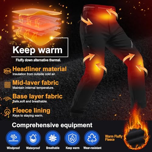 - Material: Soft shell polyester and fleece lined. Winter outdoor waterproof trousers keep your warm to resist extremely cold weather, while maintain good breathability