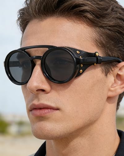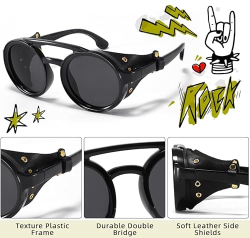- CLASSIC STYLE STEAMPUNK DESIGN-Unique retro round steampunk retro style shades with leather side shields thar are strikingly dope. You will never be unnoticed with its unique gothic style. Can match almost all your outfits, this is one of the best shades you could have.