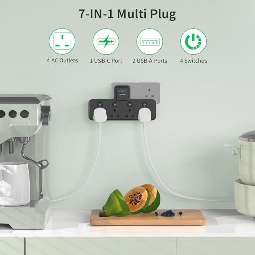 - 7 IN 1 Multi Plug Extension: This multi plug adapter features 4 AC outlets & 3 USB slots (1PD20W USB C) with independent switches, ideal for indoor use without bulky extension leads. The plug extension socket can use 7 devices simultaneously to meet your daily needs. Max capacity up to 3250W(250V/13A).