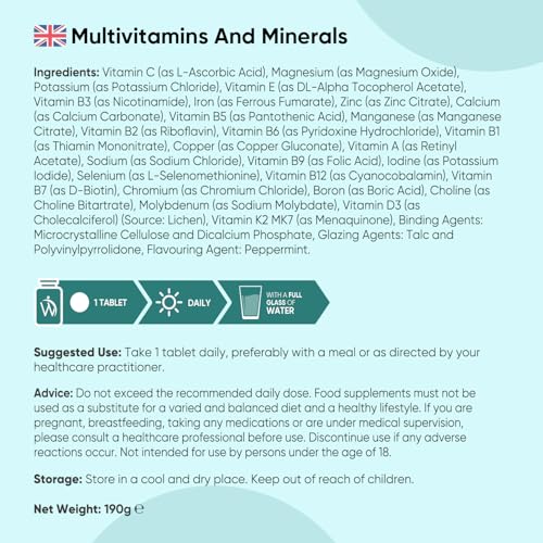 These multivitamin tablets for men & women deliver a well-rounded blend of 13 important vitamins, such as Vitamin A, B-Complex (B1, B2, B3, B5, B6, B7, B9, & B12), Vitamin C, Vitamin D3, Vitamin E, & Vitamin K2 (MK-7). These multivitamins for men & women also offer 13 vital minerals like Calcium, Chromium, Copper, Iodine, Iron, Magnesium, Molybdenum, Potassium, Selenium, Sodium, Zinc, Manganese & Boron. Additionally, Choline, a key nutrient, is included for added goodness.