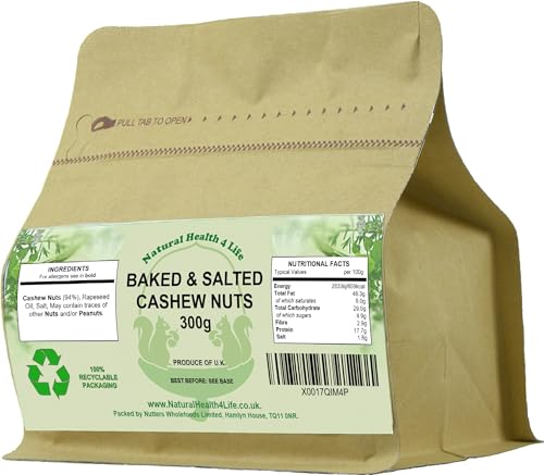 Natural Health 4 Life Baked and Salted Cashew Nuts 300g, Whole Cashew Snack, High Protein and Fibre, Low Sugar, Vegan and Gluten Free Nuts Snacks in Kraft Pouch for Snacking and Cooking