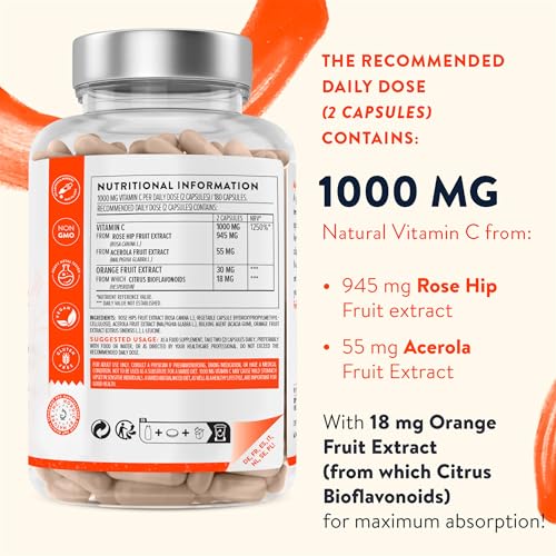 Natural High Strength Vitamin C 1000mg -180 Vitamin C tablets – 100% Vegan Acerola Fruit Extract – with Citrus Bioflavonoids and Rosehip – Vitamin C Capsules -Supports Immune Function- 3 Months Supply