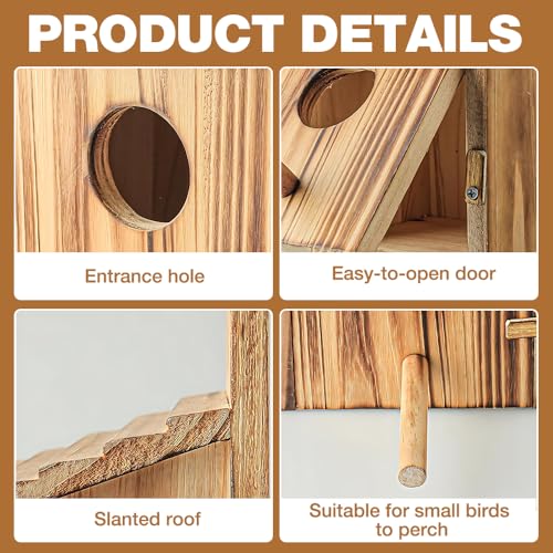 - High-Quality Materials: Made with exquisite craftsmanship from high-quality natural wood, wooden bird box large boasts a novel and unique design. It is sturdy and durable, remaining intact even in harsh outdoor conditions such as high temperatures and strong winds, providing a safe habitat for birds