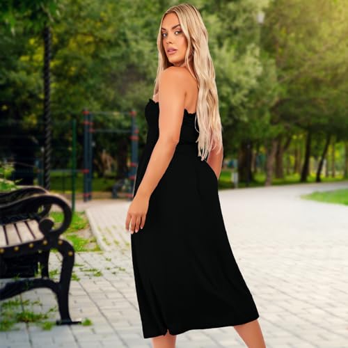 NetSetUK Women's Strapless Sheering Boob Tube Gather Oversized Plus Size Elasticated Bust Bandeau Plain Beach Summer Sleeveless Top Midi Dress for Ladies 8-22 Black