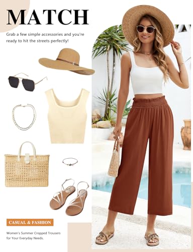 Niwicee Womens Linen Trousers 3/4 Cropped Trousers High Waisted Elasticated Wide Leg Pants Summer Culottes Loose Causal Lightweight Pants with Pockets (Brick Red, S)