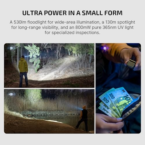 - 【Ultimate 3-in-1 Lighting】A 530lm floodlight for wide-area illumination, a 130m spotlight for long-range visibility, and an 800mW pure 365nm UV light for specialized inspections—ready for any situation