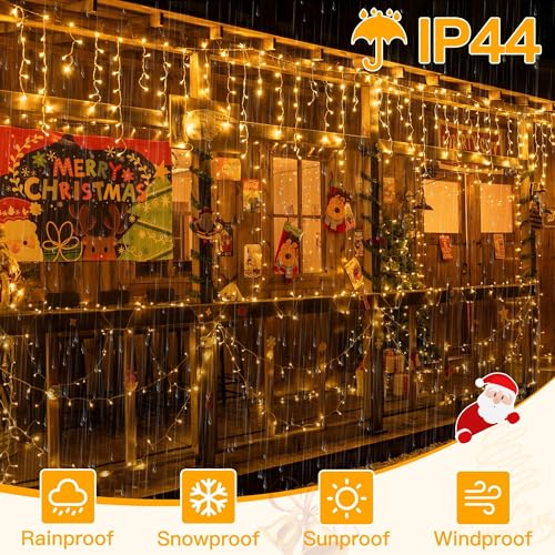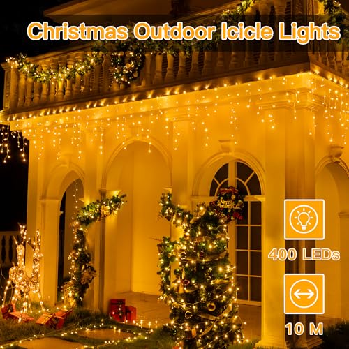 Ollny Icicle Outdoor Christmas Lights, 10M 400 LED Waterproof Hanging Fairy Light, Plug/Remote/8 Modes/Timer/Connectable Warm White String Light, Lighting Outside Gutter House Roof Xmas Decorations