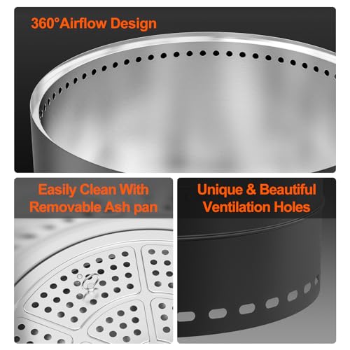 - 【Thoughtful Smokeless Design】- Double-wall structure and a unique airflow system that maximize airflow and burning process,allowing the wood to burn with little smoke, sparks, ash, or odors. The vent holes on the top of the pit allow oxygen to enter, mix the smoke and help charcoal to secondary burn.It reduces the smoke and increases the usage rate of charcoal.The fire pit allows you to grill and enjoys gathering with friends.