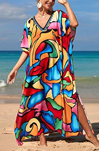 Orshoy Womens Printed Kaftan Beach Dress Loose Kimono Tunic Swimsuit Bikini Cover Up Summer One Size A-Multicolour 4