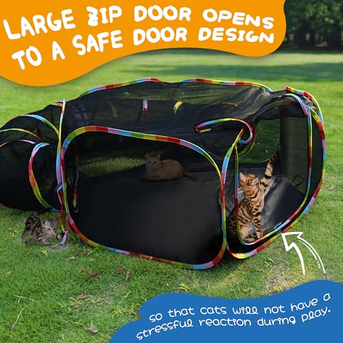 Outdoor Cat Tunnel and Play Tent, Rainbow Coloured, Mesh Enclosure with Connecting Tunnel