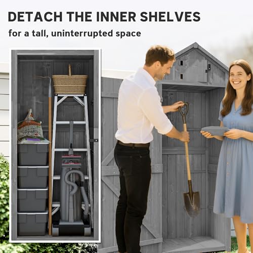 - ORGANIZE YOUR TOOLS: 3 detachable shelves for small items and a larger area for longer tools. This tool shed is very suitable for storing gardening tools and outdoor equipment.