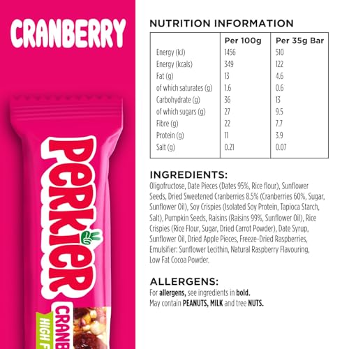 Perkier Cranberry Bars (18 Bars), Vegan, Gluten Free, Protein, Lower Sugar, Office Snacks, Healthy Snacks for Adults, Low Calorie, Halal, Breakfast Bar, High Fibre, Gut Health, Multipack