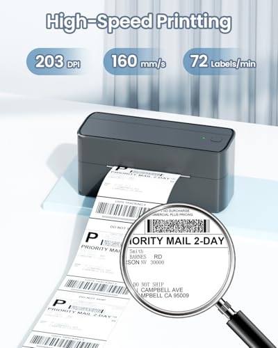 - Phomemo 241BT Thermal Label Printer – Featuring an imported thermal printer head, the 203 DPI resolution ensures clear and accurate printing. With a print speed of 150 mm/sec, this thermal label printer can print up to 72 4×6 labels per minute, the high speed can improve your work efficiency, stable and durable, long time continuous work, and still can print clear barcodes and graphics