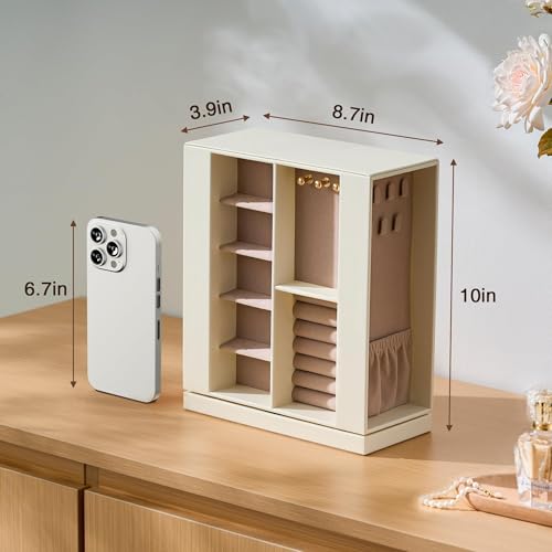 pickpiff Jewelry Box Organizer for Women: 360 Rotating Vertical Storage Case, White Leather with Blush Velvet, Ring Necklace Bracelet Holder, Gift Decor, 10 x 8.7 x 3.9 in