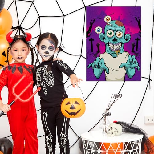 - Halloween Party Game: 1 × large zombie poster, 1 × zombie card, 2 × blindfold, 24 × zombie eye stickers, 1 × sheet dot stickers. Great for Halloween party games, Halloween party favors, zombie themed party decorations