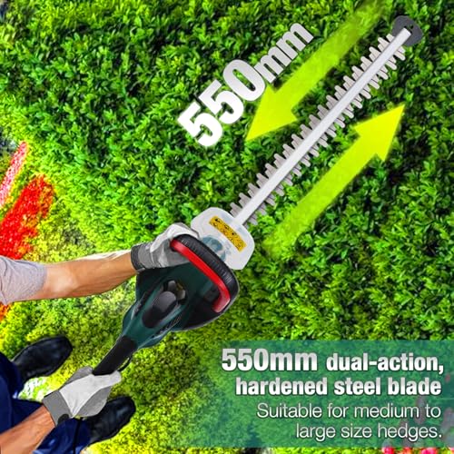- ðãDUAL ACTION BLADEãEquipped with a 55cm Laser-Cut Diamond blade with a cutting capacity of 16mm. This bush cutter cuts once and catches the branch again on the way back, which means this corded hedge trimmer can cut more efficiently