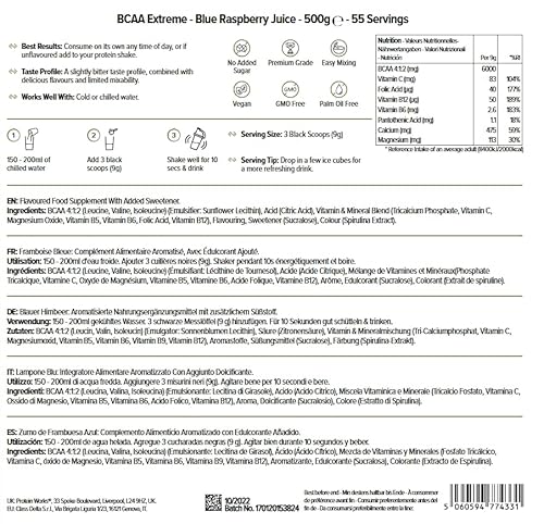 Protein Works – BCAA Extreme, 6000mg BCAAs per Serving, Intense Workout & Energy Drink Powder, Optimal BCAA 4:1:2 Ratio + Magnesium, Calcium, Vitamin C, Blue Raspberry Juice, 55 Servings, 500g