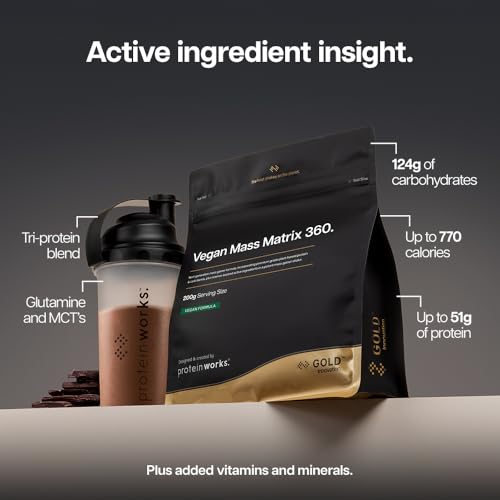 Protein Works | Vegan Mass Matrix 360 – Gold Innovation, Vegan Mass Gainer, Weight Gain Supplement, Tri Protein Blend, Amino Acids, Post Workout Protein Shake, Chocolate Silk, 5 Servings, 1kg