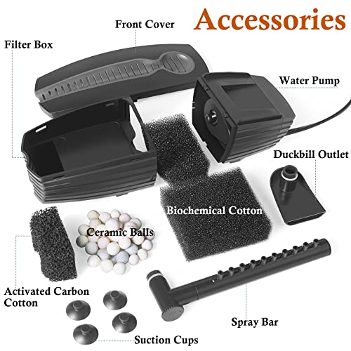 - 【Powerful Internal Filter】600L/H large water flow, excellent filter performance. And there are four strong suction cups in the aquarium filter, which can firmly install the filter in the fish tank without slipping off easily.