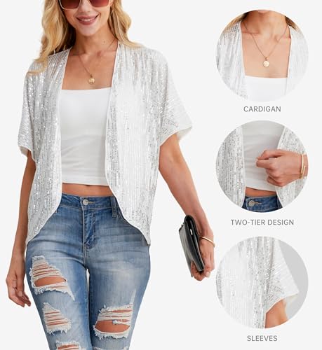 QIXING Women's Sequin Sparkle Lightweight Short Sleeve Cardigan Casual Party Clubwear Cover Up Glitter Shrug Sequin Jacket(Silver, L)
