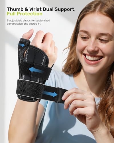 - 【Dual Support System for Comprehensive Stability】Engineered for superior stability, this thumb spica splint right hand features two reinforced thumb support strips and three aluminum wrist splints, ensuring firm, contoured stability. The thumb barce provides targeted protection, helping to alleviate discomfort from carpal tunnel syndrome, De Quervain’s tenosynovitis, injuries, arthritis, trigger finger, and strain.