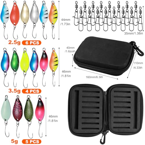 - 【16 Pcs/3 Sizes fishing trout spinners set】Including 2.5g/3.5g/5g fishing trout spinners & 16 Pcs 2# rolling fishing swivels and clips, all neatly stored in a high-quality zippered storage box. The sharp hook has strong penetration power, and the compact size makes it easier to operate in water