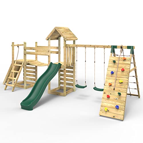 - 🟢 FLEXIBLE BRIDGE – A flexible wooden bridge connects this impressive wooden playset's two climbing towers