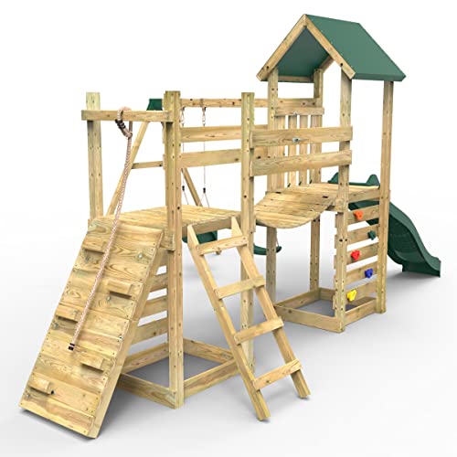 - 🟢 FLEXIBLE BRIDGE – A flexible wooden bridge connects this impressive wooden playset's two climbing towers