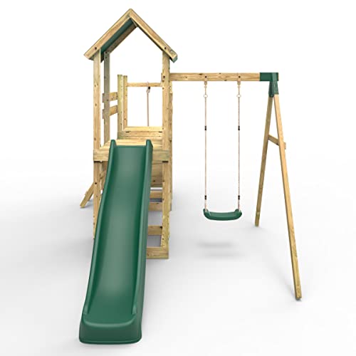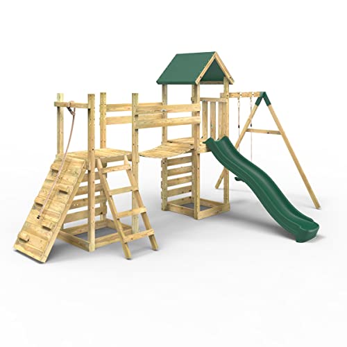 - 🟢 FLEXIBLE BRIDGE – A flexible wooden bridge connects this impressive wooden playset's two climbing towers