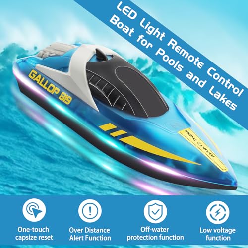 Remote Control Boat with LED Light, RC Boat Low Battery Alarm(Rechargeable), Self-Righting 9.3MPH, 2.4GHz Full Proportional Remote Control Boats for Kids/Adults, For Pools/Lakes Speed Boats