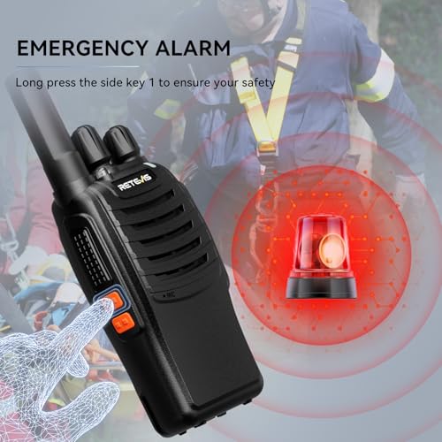 - Emergency Alert; In case of an emergency, you can activate the alert by long-pressing the UP button, which will notify other paired walkie talkies, enhancing safety while working