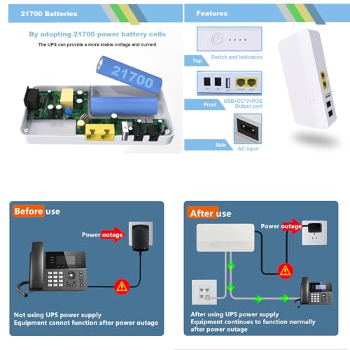 - 【 Small body and large capacity ] Built in 8000mah 29.6WH Lithium ion Backup Battery ,POE Output 24V , DC12V, 9V, 5V Output and One USB DV5V 2.5A Output, Support power outage and battery life for routers, light cats, LED lights, CCTV cameras, attendance check-in machines, smart phones, switches, and laptops. After a power outage, the equipment can continue to work