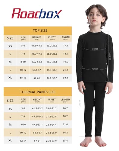 Roadbox Boys Thermal Underwear Set – Kids Fleece Lined Tops & Bottom Compression Soft Long Johns Base Layer for Skiing Black
