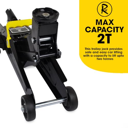 - The RocwooD RWTJ2.0 Trolley Jack is the perfect accessory to help you change a tyre or sort issues under your car. Handily compact paired with a integrated carry handle, ideal for keeping in the garage or boot of your car. This Trolley Jack provides safe and easy car lifting with a capacity to lift up to two tonnes. Suitable for most cars with a automatic safety overload valve. Manufactured from heavy duty steel with a durable weld construction providing a long lasting service life.
