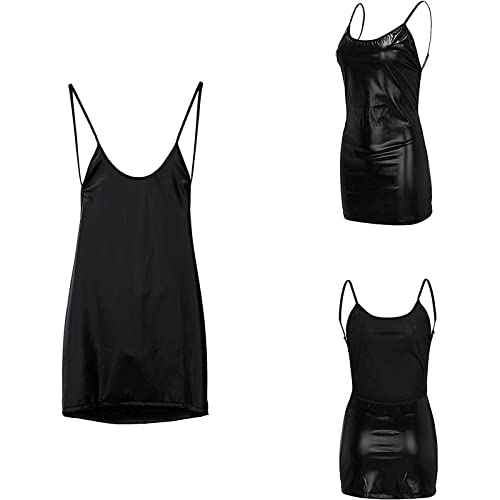 ROSVAJFY Women's Sexy Backless Wet Look Leather Bodycon Mini Dress PU Cami Strappy Fitted Party Clubwear Latex Sleeveless Cocktail Shiny Metallic Night Out Dress Black