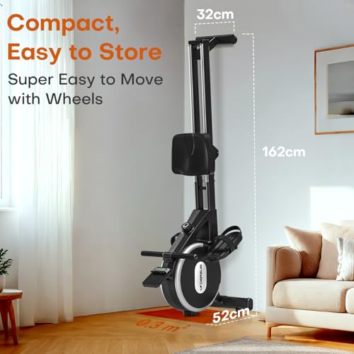 The rower arrives 80% pre-assembled and can be set up in about 20 minutes. With built-in transport wheels and the ability to store upright, it saves up to 90% storage space, making it perfect for smaller homes or apartments.
