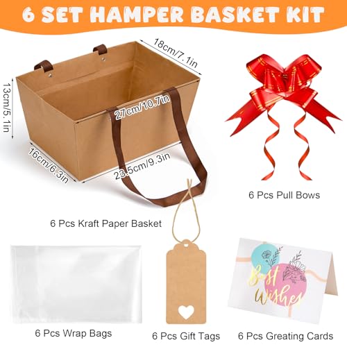 SelfTek 6 Set Gift Basket Hamper Kit, Empty Kraft Hamper Basket with Cellophane Bags, Pull Bows, Tags and Greeting Cards, Create Your Own Gift Baskets for Birthday, Christmas, Wedding