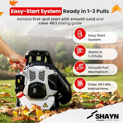 - ✅[EASY START 52CC PETROL BLOWER] – Tired of petrol leaf blower that won’t start? Our 52cc backpack petrol blower uses an improved easy-start system, smooth pull cord and a simple 40:1 mix guide, helping it start in 1–3 pulls. Perfect for beginners and professionals, this powerful garden tool gets you working fast without the frustration common in many petrol leaf blowers.
