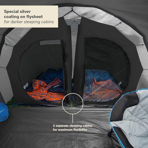 - ✔ 2 DARK SLEEPING CABINS THANKS TO SILVER COATING: The 16 m² tent has 2 dark sleeping cabins for 2 people each with their own sewn-in tent floor and mosquito net at the entrance door. In addition, this colour version has a silver coating around the sleeping cabin for an even darker sleeping space.