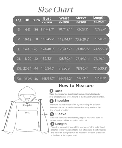- SIZE GUIDE: S=UK(6-8),EURO(36);M=UK(10-12),EURO(38);L=UK(14-16),EURO(40);XL=UK(18-20),EURO(42);XXL=UK(22-24),EURO(44)X,XXL=UK(26-28),EURO(46; suggest sizing up if you want to layer t shirts hoodies or jumper underneath.