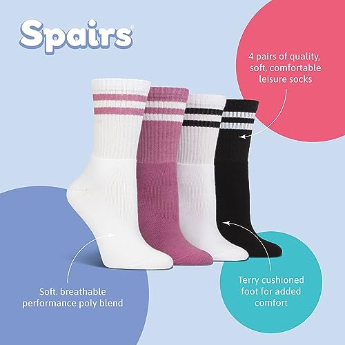 Spairs Ladies Leisure Sport Socks, Fully Cushioned Foot, Performance Yarn, Soft, Comfortable, Breathable, Crew Length, Multipack of 4 Pairs, Size 4-8 Crew White