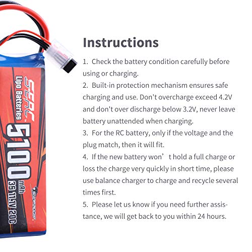 - [Voltage Note] 3s lipo battery 5100mah Built-in protection mechanism ensures safe charging and use. Don't overcharge more than 4.2V and don't over discharge below 3.2V, never leave battery unattended when charging.