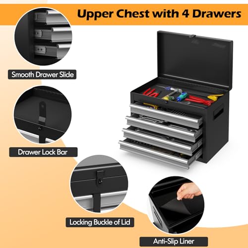 - CONVENIENT AND SAFE DESIGN: The pullout drawers are fitted with drawer slides, allowing for smooth operation, and the EVA protective liners can prevent tools from scratching the cabinet. Moreover, the upper tool chest features drawer lock bar and secure locking buckle to protect your tools safely.