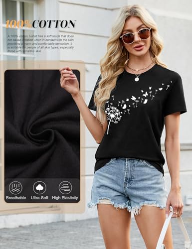 TOMEEK Women's T-Shirts Short Sleeve Ladies Tops Summer Crew Neck Basic Tops Graphic Print Tee Shirts Casual Black Tshirt(Dandelion,L)